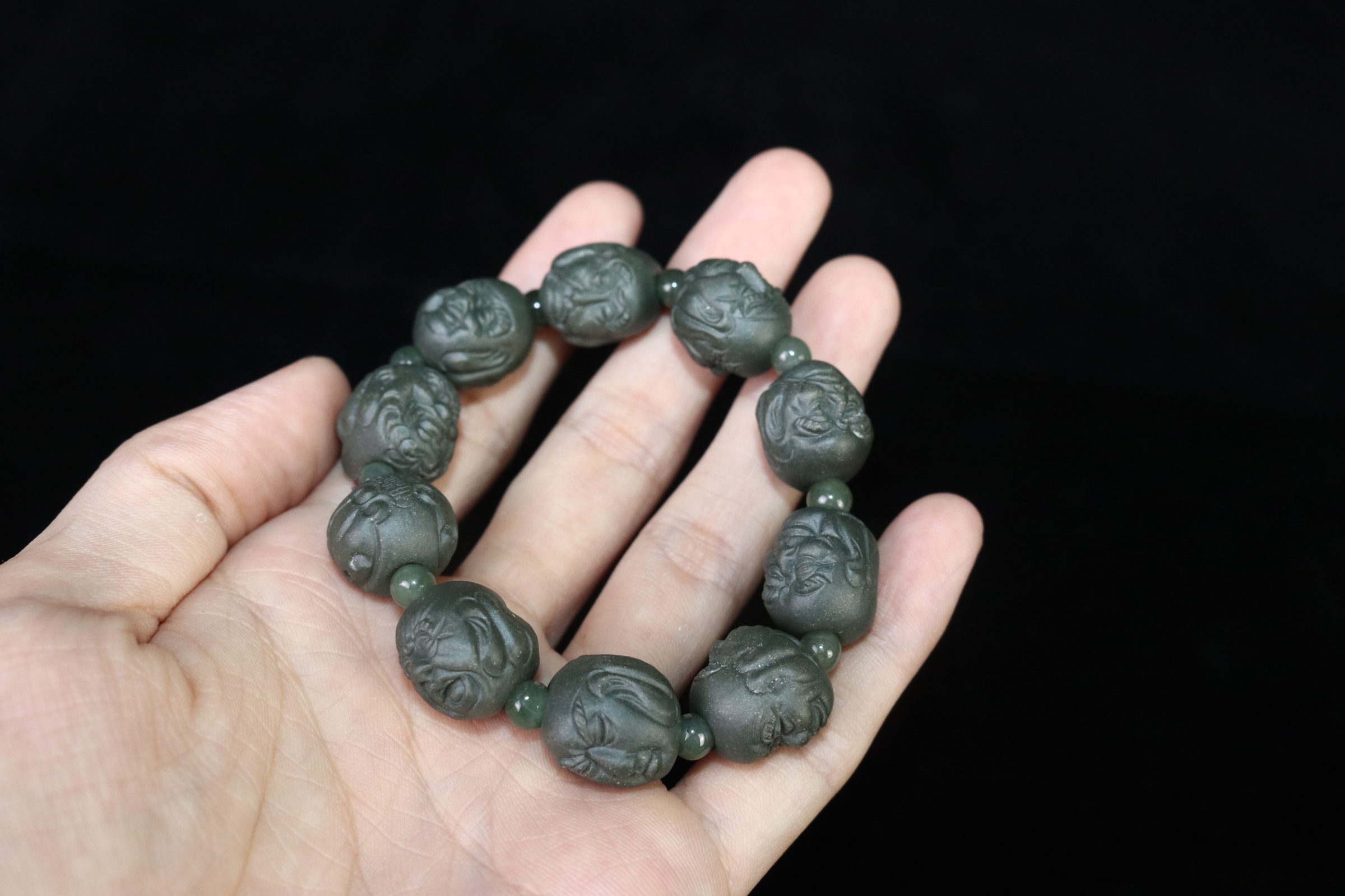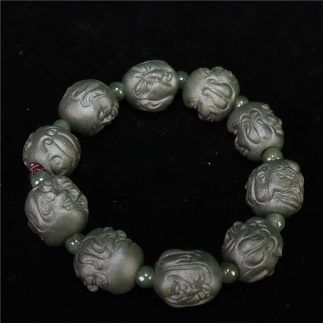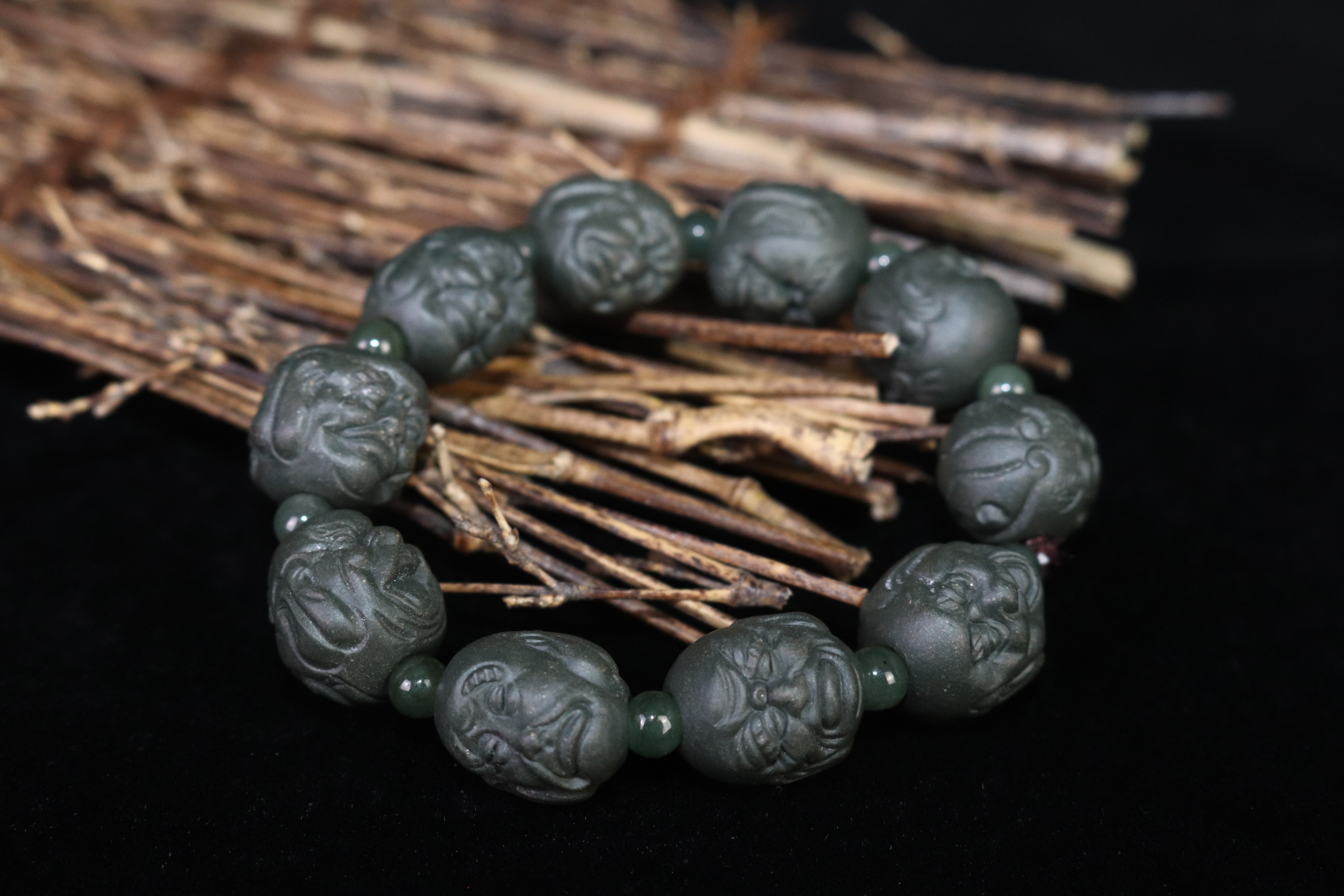 【极品紫砂手串】【难得一见】紫砂手串一串难求!黄龙山原矿墨绿泥手串,紫砂雕塑精品摆件,茶玩茶宠,每个珠子全手工理出来,非常费工费时的作品,全手工紫砂手串!全手工十八罗汉紫砂手串,精工制作,每一个罗汉的面部表情刻画都有讲究,变化莫测,无论做工和泥料都不是市场上的那种铁模压制手串可比拟的,后期养成性也极其好,因为经常上手把玩,养成后油性十足,让人爱不释手,价值高!著名陶艺家白雪山老师完全意义全手工打造手串!拥有真正原矿全手工紫砂手串(18罗汉双面手串)精工雕刻,质朴、精美!原矿紫砂里含有负离子,珠圆玉润。墨绿泥的观赏性和养成性都是极佳的,养成后深邃内敛,含而不露的色泽甚是迷人,把玩出来,更是爆润到没朋友!行家,藏友来!