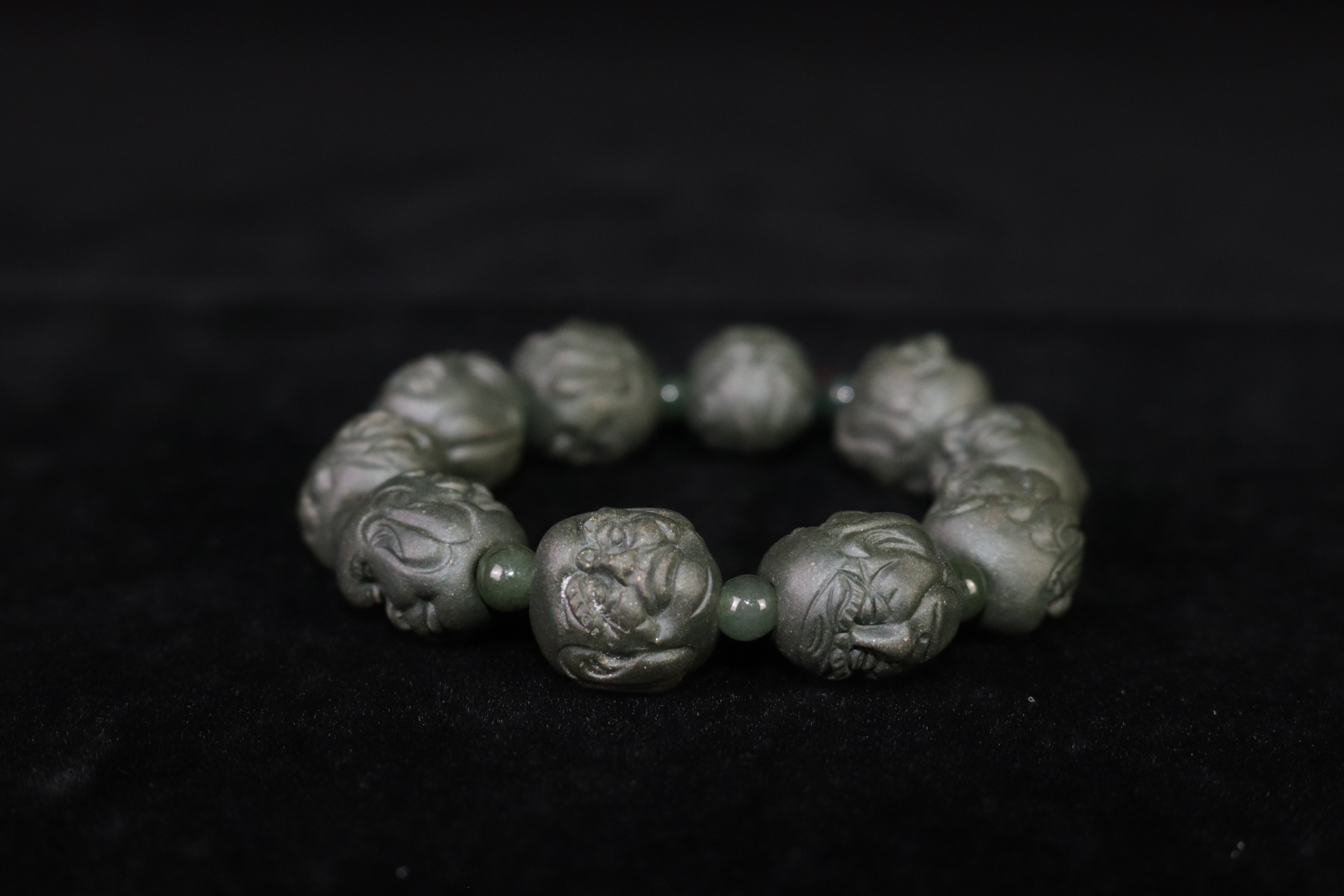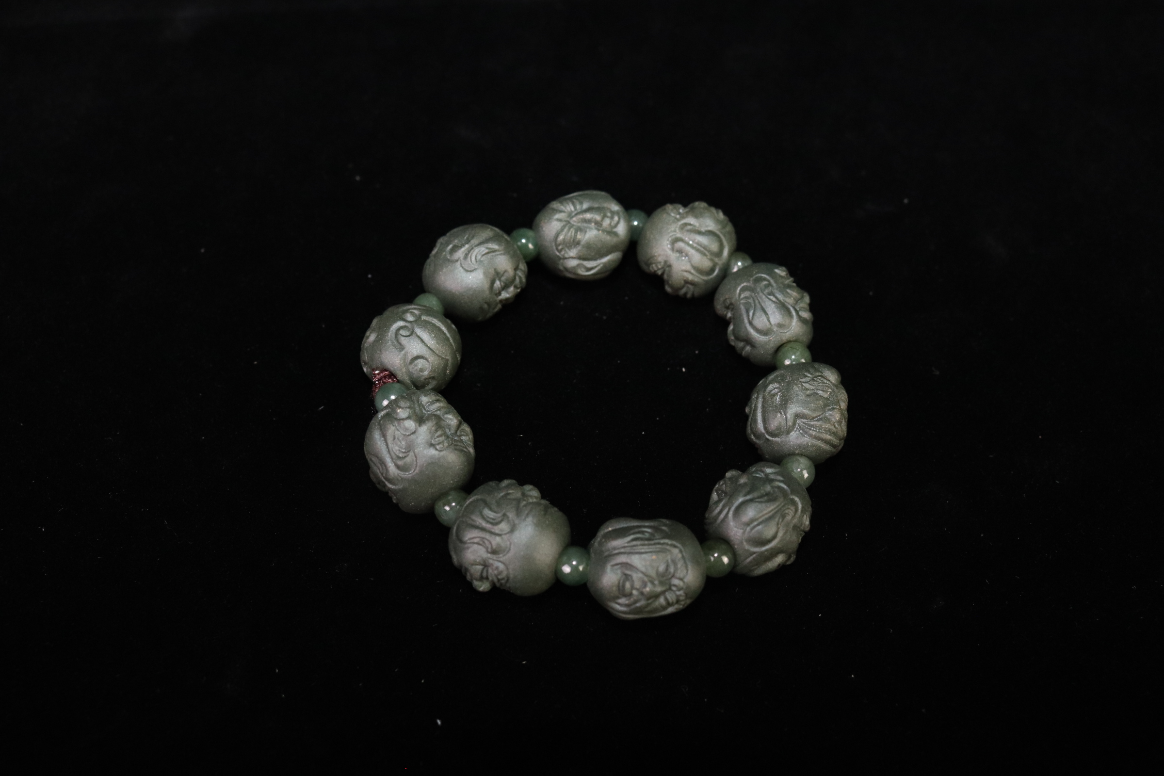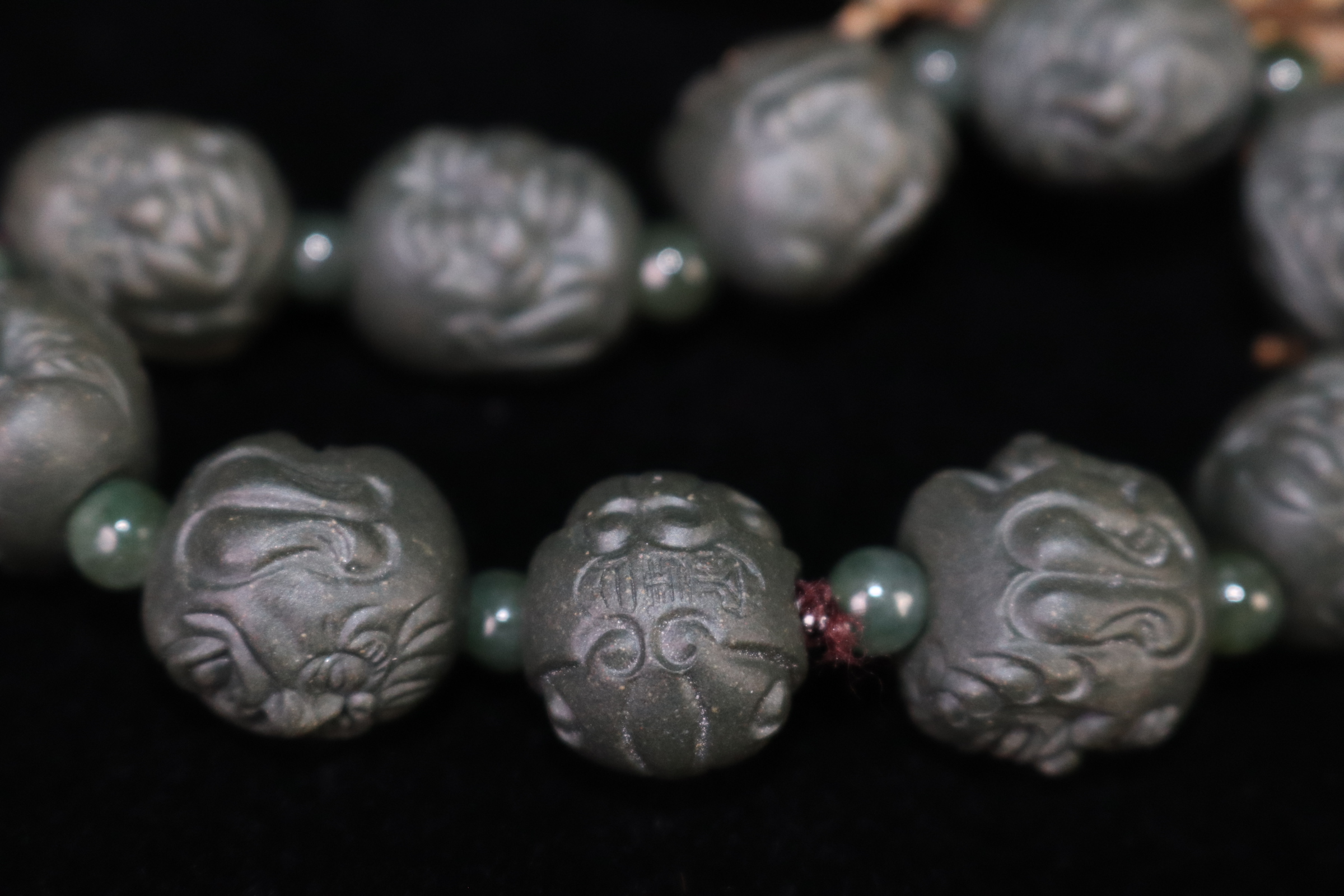 【极品紫砂手串】【难得一见】紫砂手串一串难求!黄龙山原矿墨绿泥手串,紫砂雕塑精品摆件,茶玩茶宠,每个珠子全手工理出来,非常费工费时的作品,全手工紫砂手串!全手工十八罗汉紫砂手串,精工制作,每一个罗汉的面部表情刻画都有讲究,变化莫测,无论做工和泥料都不是市场上的那种铁模压制手串可比拟的,后期养成性也极其好,因为经常上手把玩,养成后油性十足,让人爱不释手,价值高!著名陶艺家白雪山老师完全意义全手工打造手串!拥有真正原矿全手工紫砂手串(18罗汉双面手串)精工雕刻,质朴、精美!原矿紫砂里含有负离子,珠圆玉润。墨绿泥的观赏性和养成性都是极佳的,养成后深邃内敛,含而不露的色泽甚是迷人,把玩出来,更是爆润到没朋友!行家,藏友来!
